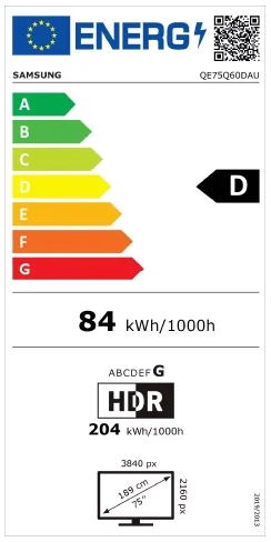 | Ekrano įstrižainė | 75" (190,5 cm) | Energijos sąnaudų klasė (A-G) | D |